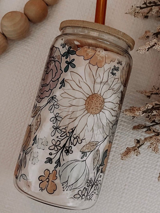 Fall Floral 16oz Glass Can Cup