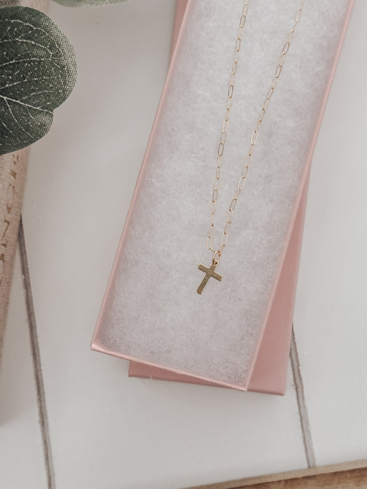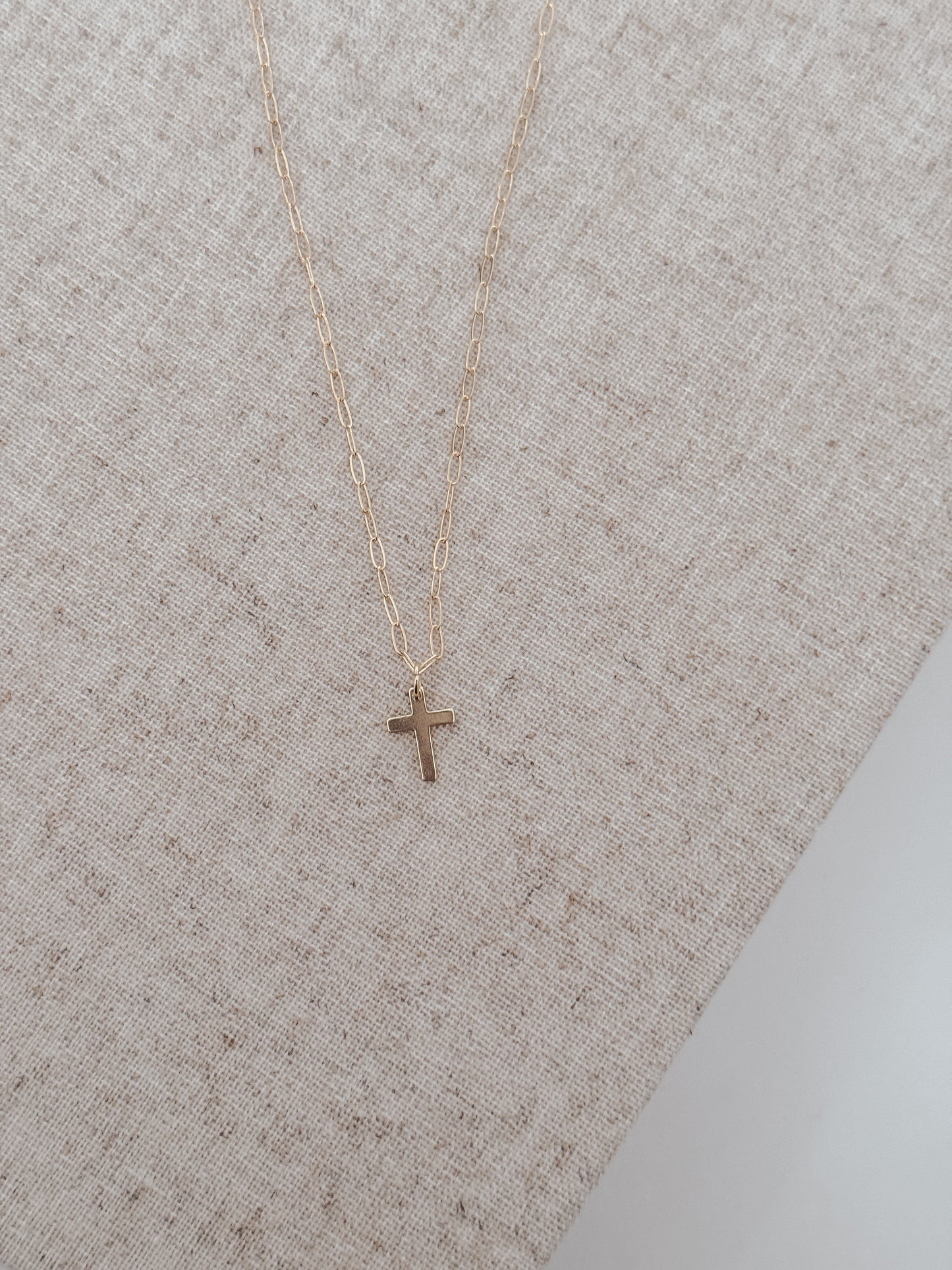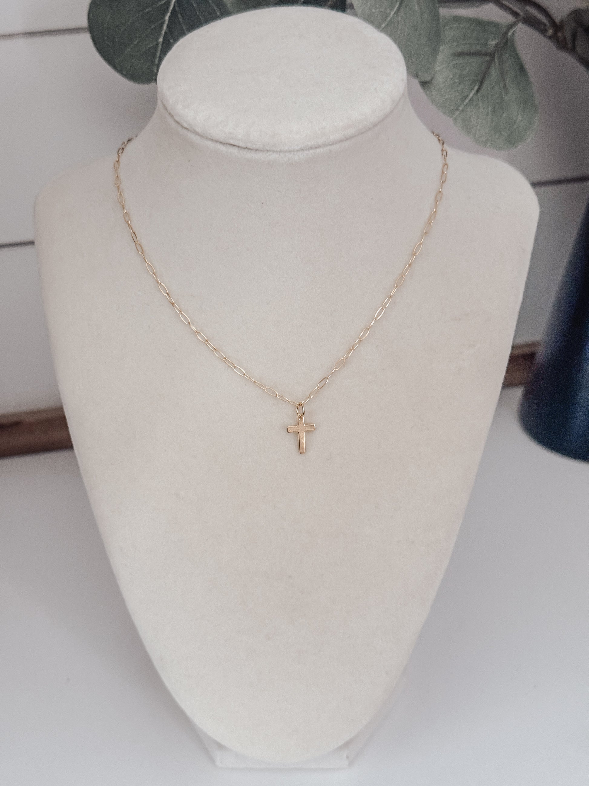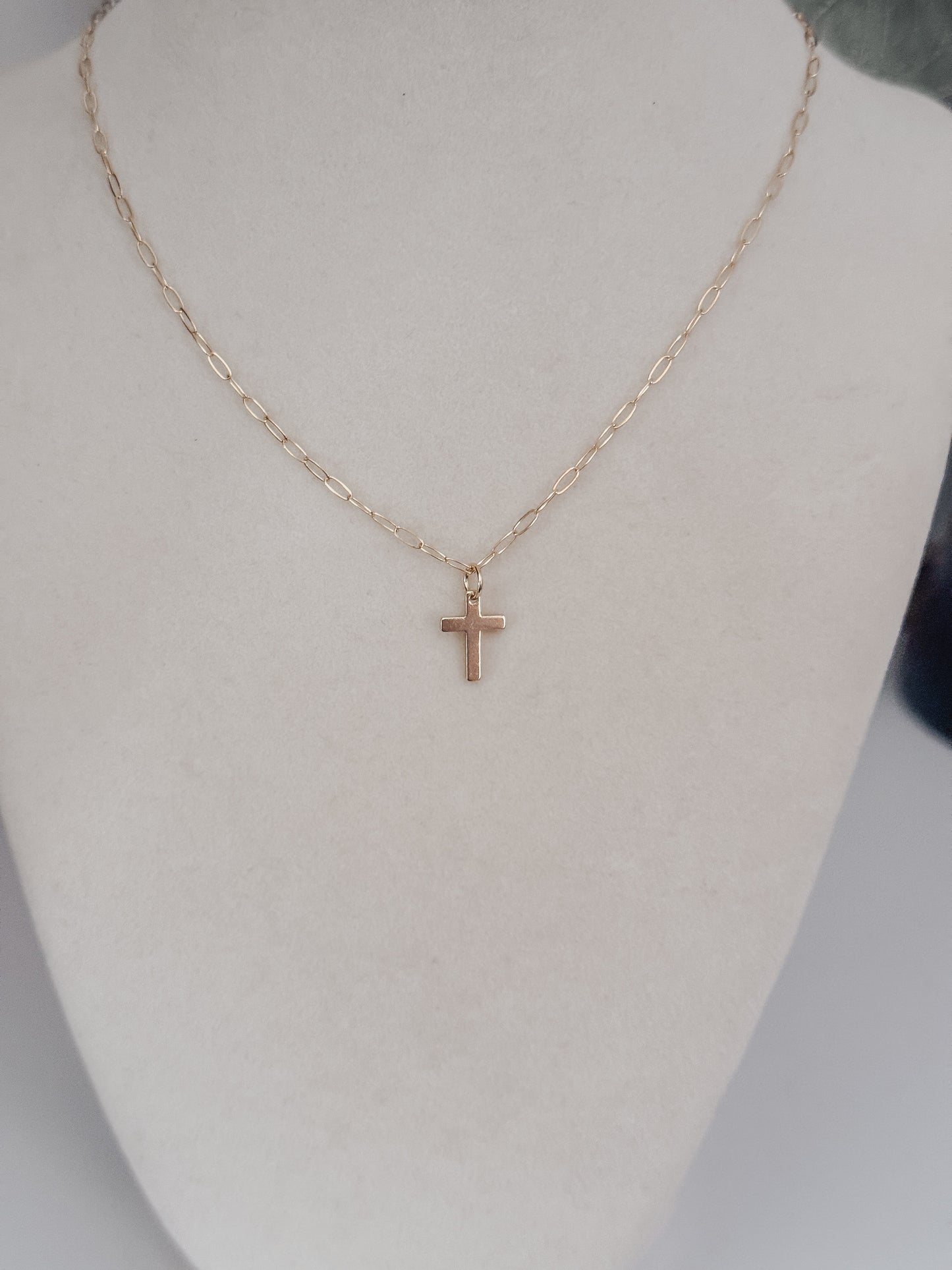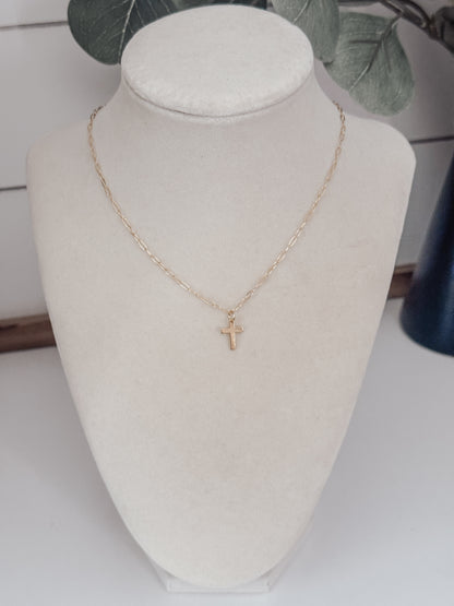 This elegant Cross Necklace features a dainty gold filled chain and a beautifully crafted cross, plated with gold for a touch of luxury. Perfect for adding a subtle touch of style to any outfit, this necklace is a timeless piece that exudes sophistication and class.