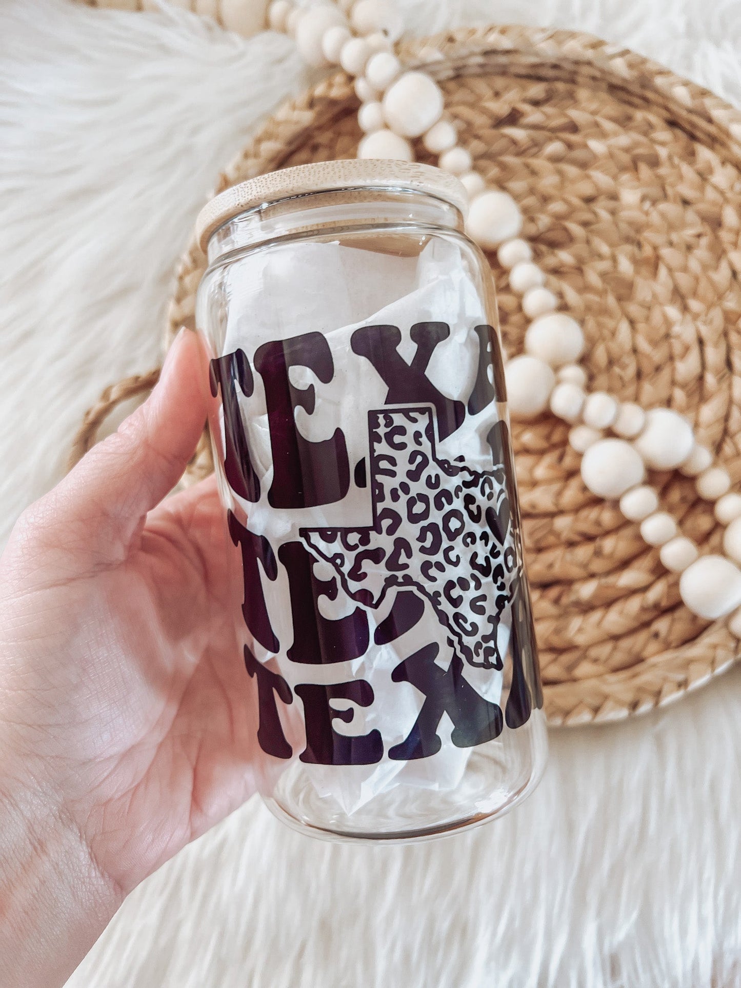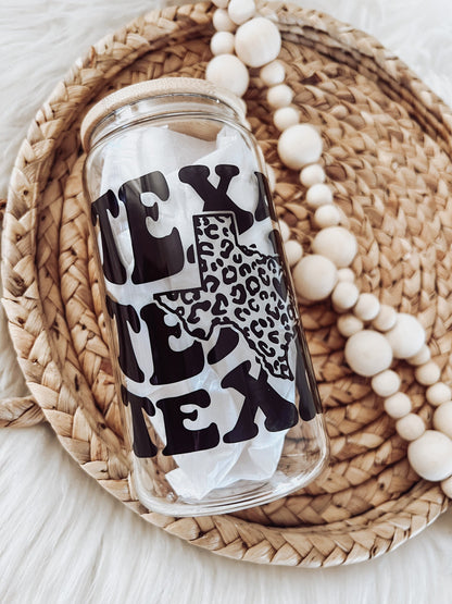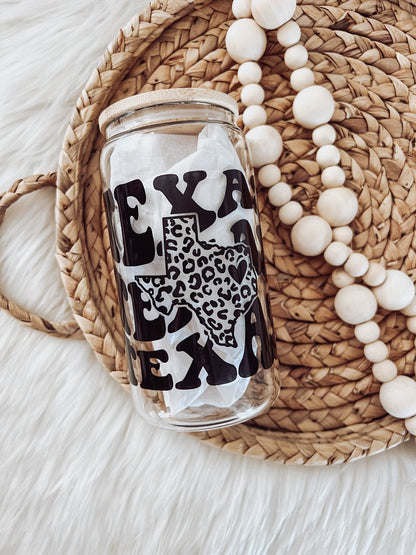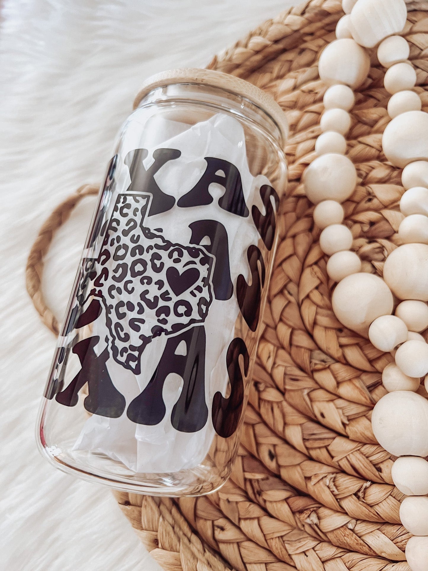 Show off your Texas state pride with our Leopard Texas State 16oz Glass Can Cup! This sleek and stylish cup is perfect for keeping your favorite drinks cold while representing your love for the Lone Star State. Cheers to showing off your Texas pride!