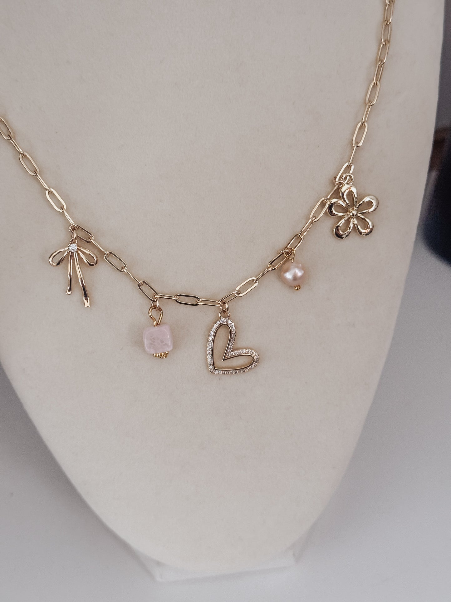 Indulge in the Pink Dreams Charm Necklace. This exquisite piece boasts a gold filled paperclip chain, adorned with a gold plated bow, pink stone, rhinestone heart, pink pearl and gold plated flower. Elegant and sophisticated, it's the perfect statement accessory for luxurious style.
