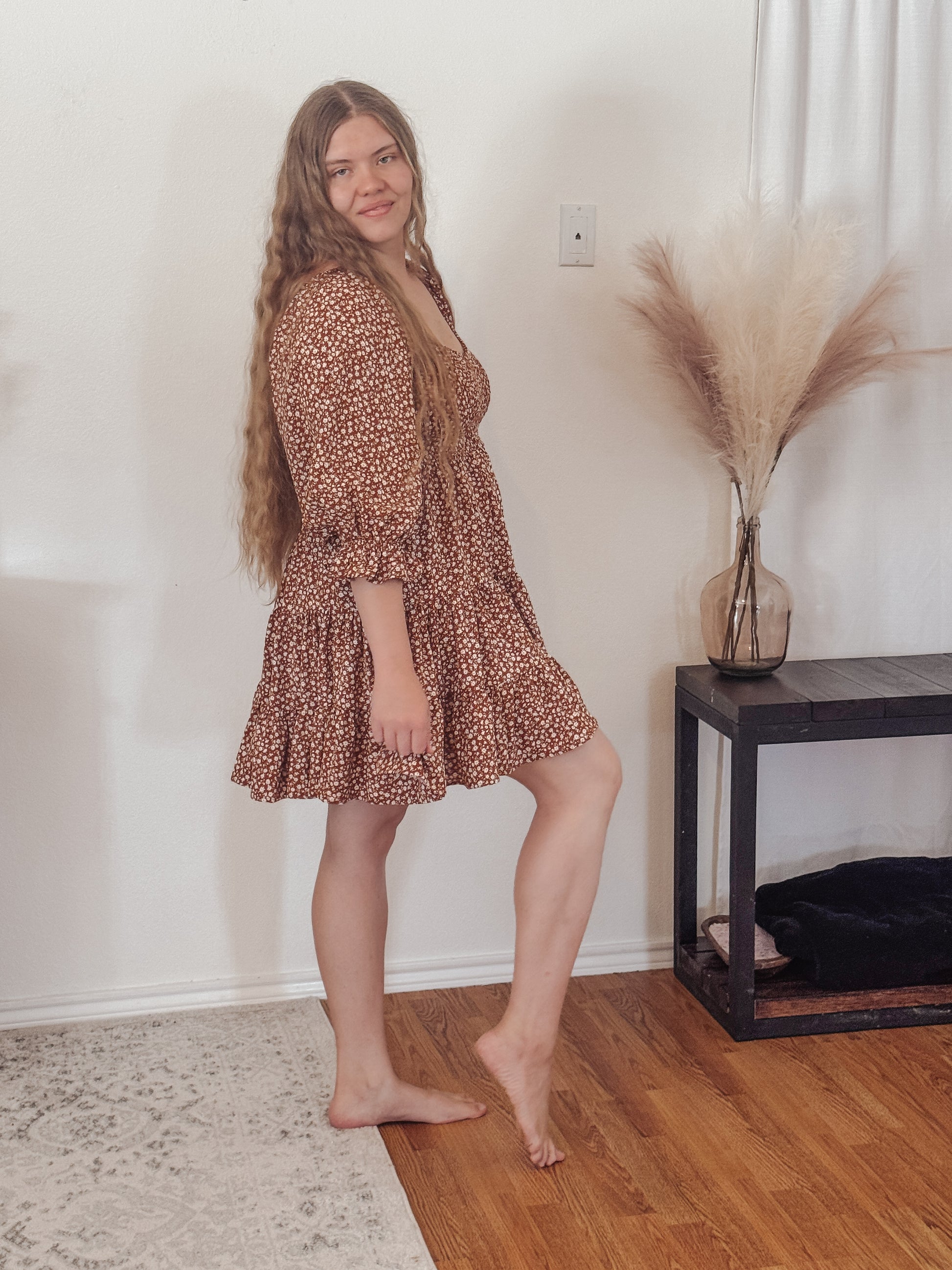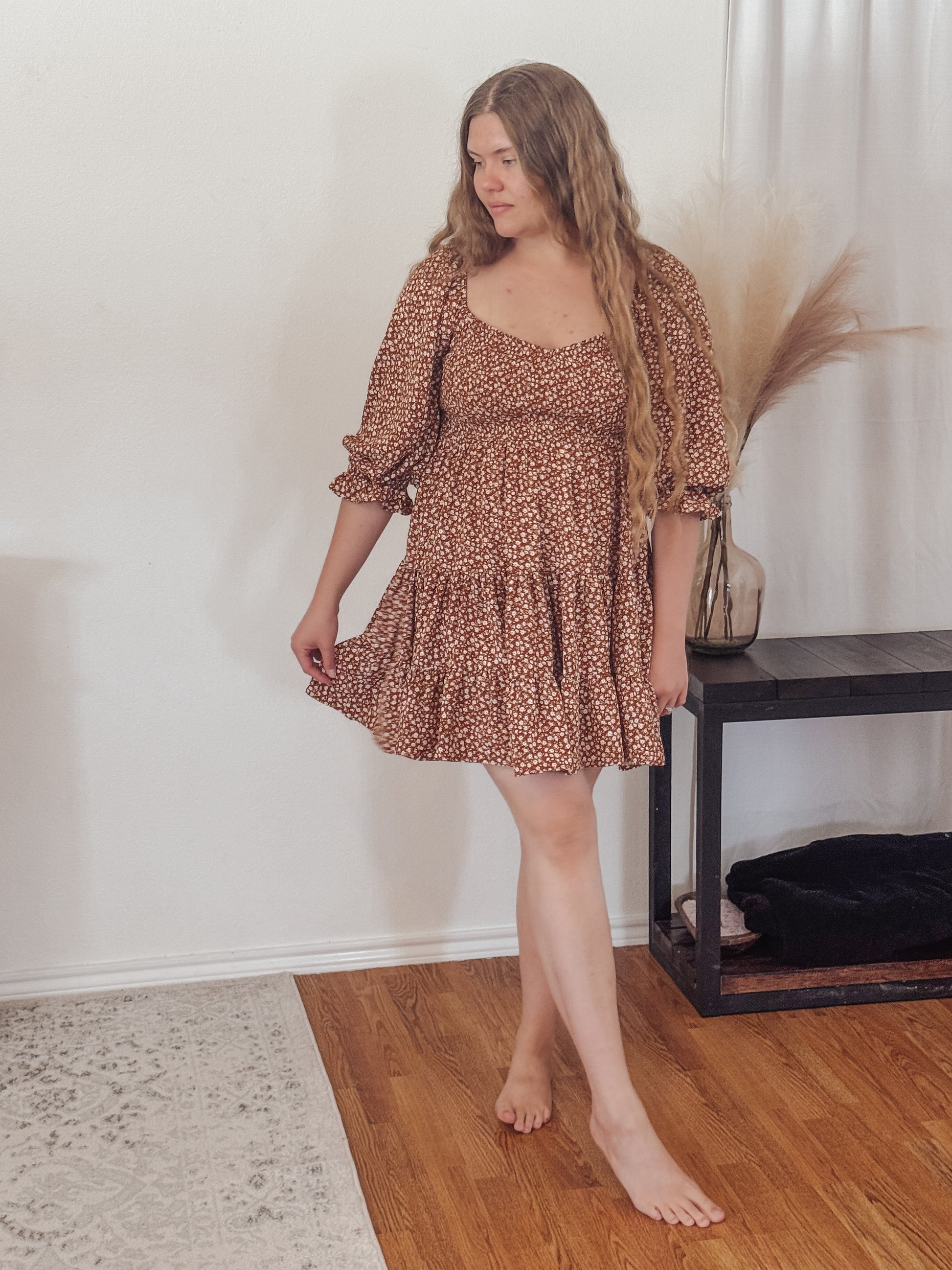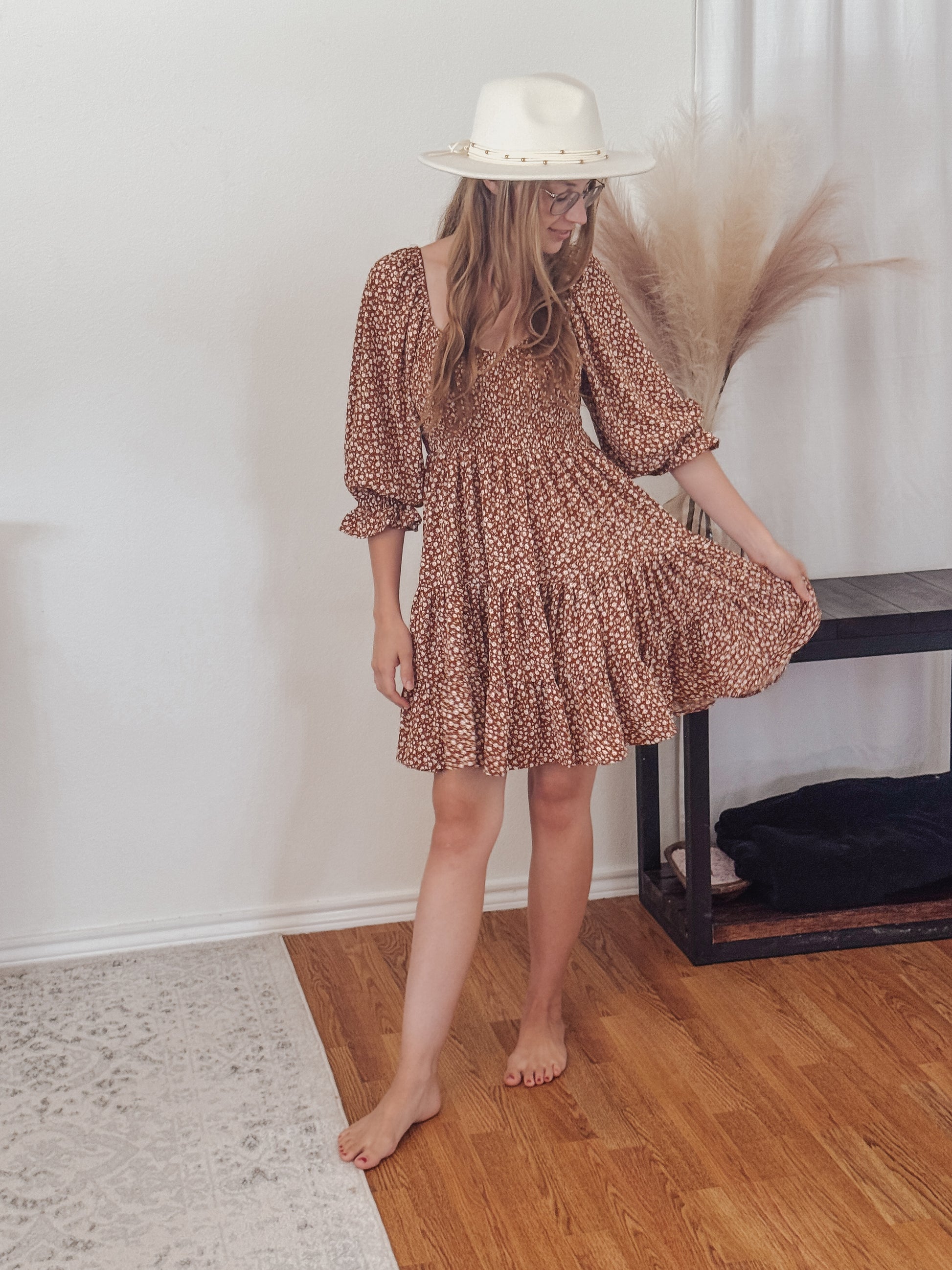 Your new fall fave is here. The Oaklyn is a flirty floral mini designed with a stretchy smocked waist, flowy tiered skirt, and voluminous puff sleeves for the perfect feminine touch. Crafted in a warm mocha-brown with ditsy cream florals, she’s made for pumpkin patches, coffee dates, and cozy nights out.