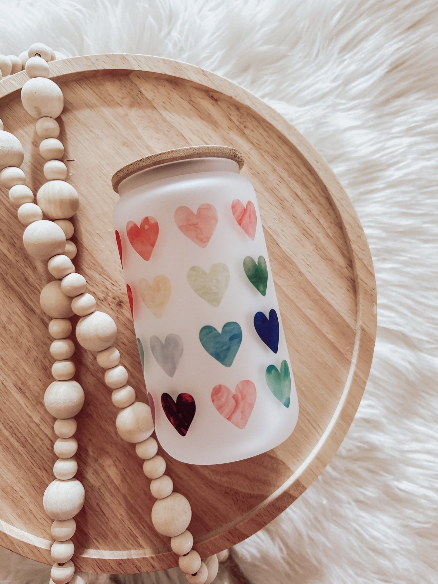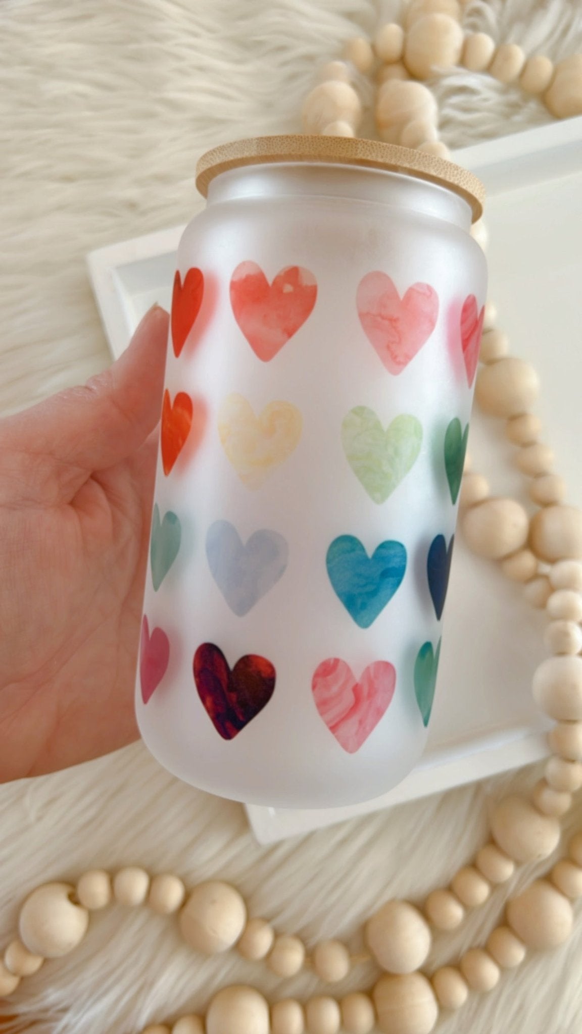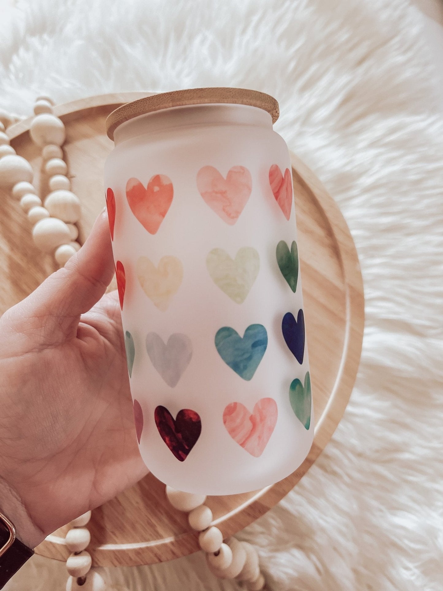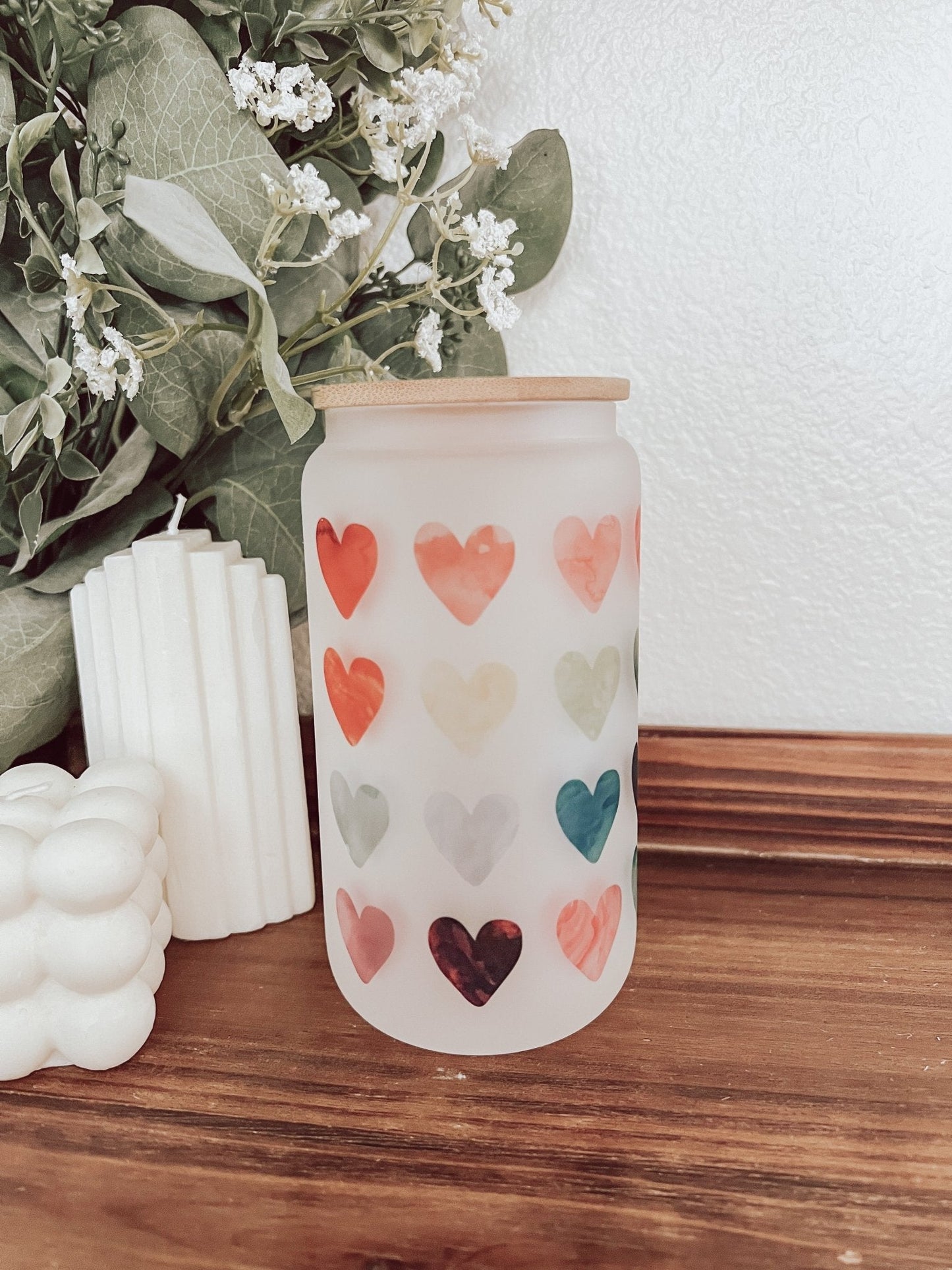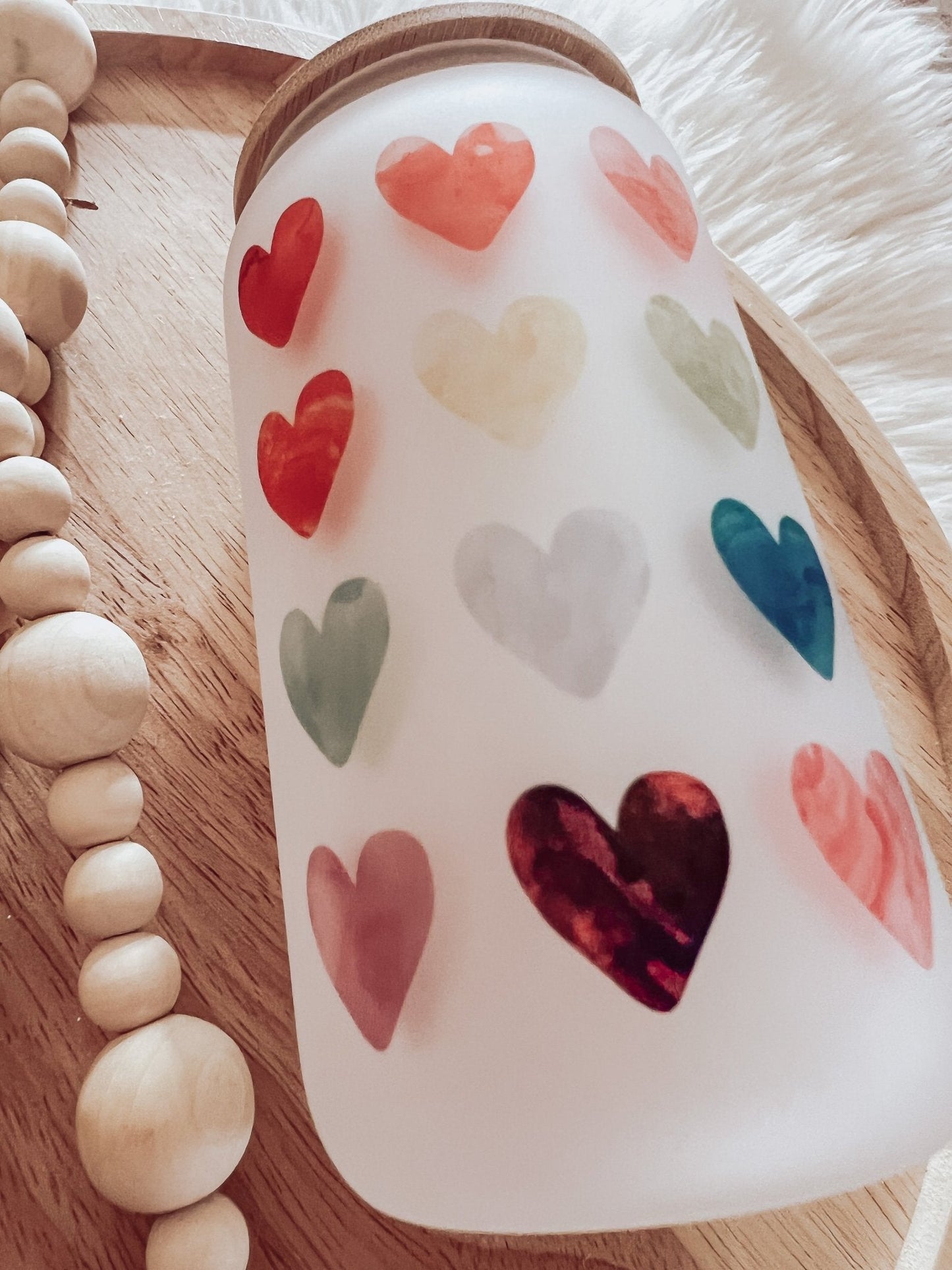 Watercolor Hearts Frosted 16oz Glass Can Cup